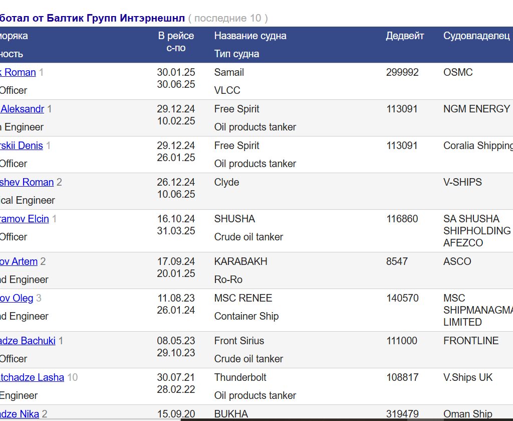 Analysis of vacancies from all offices of “Baltic Group International Ltd” shows that they are actively and massively recruiting crew members for tankers. For example, from the Batumi office of this corporation at the end of 2024, Russian Shein Aleksandr was employed for positions on the tanker “Free Spirit” with IMO number 9409259 as Fourth Engineer and Russian Denis Kostyrskii as Third Officer.