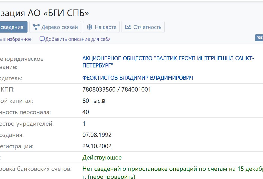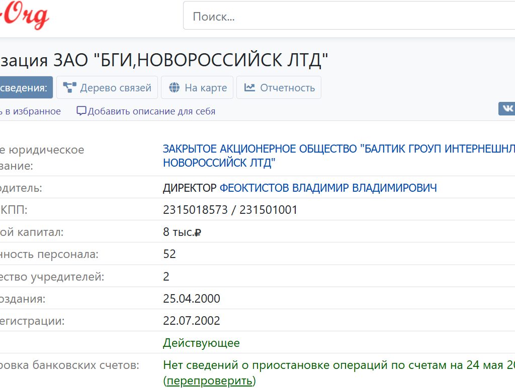 The above-mentioned companies, namely CJSC “Baltic Group International Novorossiysk” («Балтик Гроуп Интернешнл Новороссийск»), tax code 2315018573 and JSC “Baltic Group International St. Petersburg”(«Балтик Гроуп Интернешнл Санкт-Петербург»), tax code 7808033560 and license for employment of seafarers 1520160155, have a joint director, Vladimir Feoktistov, and the second of the mentioned companies in the Russian registers is directly indicated with the above-mentioned English company “V.Ships”, namely “V Ships UK Group LTD”.