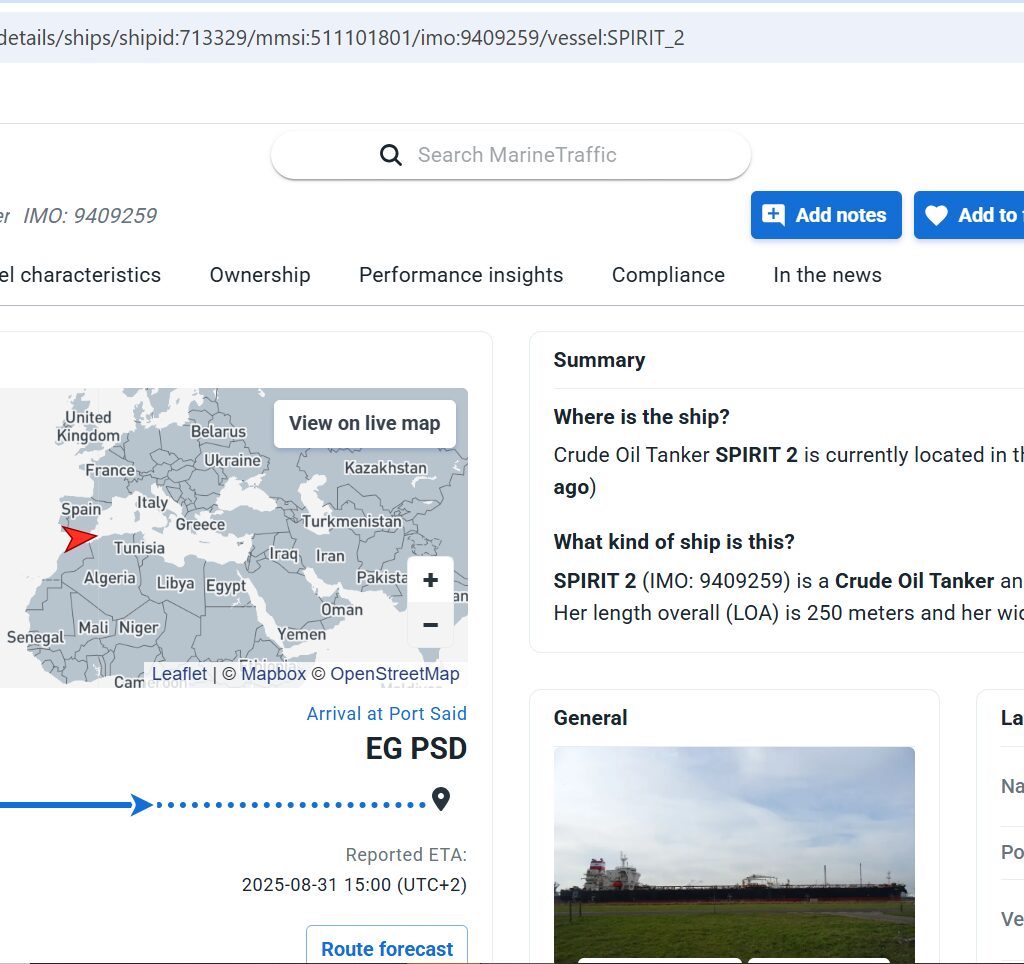 In early 2025, this vessel, which actively transports Russian oil products, changed its name to “Spirit 2” under the flag of Panama and then Palau, but this did not prevent it from being included on July 17, 2025 by the United Kingdom in the sanctions lists precisely for the transportation of Russian oil to third countries, and in August 2025 the tanker was transporting Russian oil from Ust-Luga towards the Suez Canal.