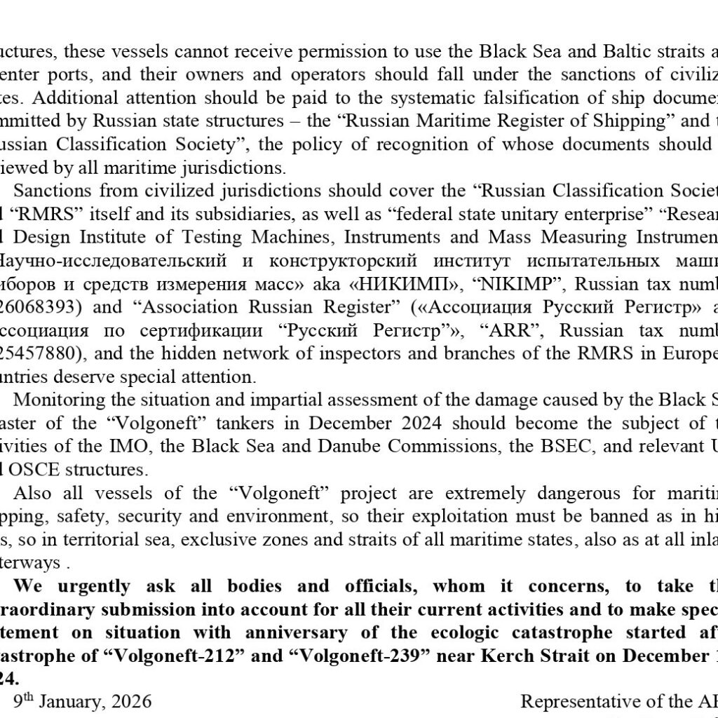 Серед іншого ми вимагаємо посилити відповідну санкційну політику проти російських морських адміністрацій та класифікаційних товариств, а також заборонити танкерам категорії “Волгонєфть” користування міжнародними протоками, каналами, внутрішніми водними шляхами та заходи до портів третіх країн.